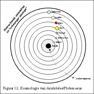 Eén van de aspecten van Aristoteles’ filosofie was zijn kosmologisch model, zijn model van hoe de kosmos, de wereld van sterren en planeten in elkaar zit. De bijgaande figuur geeft daar een beeld van. Rond het geheel dacht men zich de hemelkoepel waaraan de sterren bevestigd waren, eeuwig vast en onbeweeglijk. Daarbinnen concentrische bollen, sferen genoemd. Aan elk van deze sferen was een hemellichaam bevestigd, een planeet, de maan of de zon. Deze sferen draaiden rond en namen de daaraan bevestigde hemellichamen mee. Elke sfeer had zijn eigen snelheid. In het middelpunt stond, onbeweeglijk, de aarde. Die hemellichamen vertegenwoordigden allerlei goden of lichtwezens. En achter al die hemellichamen, achter die hemelbol, dacht men zich de oppergod, de onbewogen beweger, die het alles in beweging had gezet, zodat het nu eeuwig kon blijven ronddraaien. Rond, want de bol, de cirkel was de volmaakte vorm. In die kosmos waren dan ook alle bewegingen cirkelvormig. Behalve in het gebied beneden de maan, het ondermaanse, want daar waren alle bewegingen rechtlijnig. Zo werd dat verordonneerd. Maar een kogel bijv. heeft toch een boogvormige baan? Ja, maar dat geloofde men niet, men nam zonder waarneming aan, dat zo’n kogel rechtlijnig vooruit ging tot boven de plaats waar hij zou neervallen, en dat hij dan verticaal naar beneden plofte! En ook die planetenbanen waren niet eenparig. Van de aarde uit gezien liepen planeten soms terug in hun baan. Om dat probleem op te lossen had men allerlei hulpbanen bedacht, epicykels genoemd, zodat de schone schijn kon worden opgehouden en toch de berekeningen klopten. Dit model van Aristoteles was aangepast aan deze meer realistische eisen door een zekere Ptolemaeus. In dat ondermaanse was verandering mogelijk. Dat was moeilijk tegen te spreken, dat kon ieder direct waarnemen. Maar daarboven, in het bovenmaanse, daar was geen verandering mogelijk, daar bleef alles eeuwig hetzelfde. Dat vond zijn bevestiging in de Bijbel, zo vond men. Kijk maar: “…de Vader van de hemellichten; bij hem is nooit enige verandering of verduistering waar te nemen” (Jacobus 1:17b). Dit model sprak dus over de kosmos, de aarde, de zon, de maan, etcetera. De Bijbel doet dat ook. En waar nu de Bijbel over deze dingen spreekt, werden die dus geïnterpreteerd vanuit dit kosmologische model. Dus als de Bijbel zegt: “Vast staat de wereld, zij wankelt niet” (o.a. Psalm 93:1), dan keek men naar dit model en zei: Ja, dat klopt, de wereld (aarde) staat vast in het midden en dat zal eeuwig zo blijven. Zei Jozua: “Zon, sta stil!” (Jozua 10:12), dan keek men weer naar dit model en zei: Ja, dat klopt, de zon draait om de aarde. Men behandelde de bijbelteksten dus, alsof ze wetenschappelijke taal spraken in plaats van gewone alledaagse, voor ieder mens verstaanbare taal. Wij zeggen toch ook: zo vast als een huis, maar weten tegelijk dat dat nog wel eens tegenvalt. Ook zeggen we: de zon komt op / gaat onder. En ook dat is gewone spreektaal en geen wetenschappelijke model-taal. Maar wie durfde de grote autoriteit Aristoteles tegenspreken? Zeker niet meer, sinds hij door het gezag van de kerk gedekt werd! |