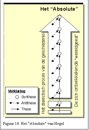 Een tweede aspect van Hegels denken, dat met dat eerste in nauw verband staat, is zijn nadruk op de 'Wereldgeest'. Daarmee wordt niet God bedoeld, of de Geest van God, maar een soort kosmische al-geest, een beetje vergelijkbaar met dat wat later Teilhard de Chardin zou beweren. Die kosmische Wereldgeest manifesteert zich als het ware in het geheel van de menselijke geest (wat Teilhard de noösfeer noemde). Het lichaam, de materie, is voor die Wereldgeest eigenlijk een beperkende omstandigheid, net als bij Plato. Die Wereldgeest ontwikkelt zich nu vanaf het begin in de richting van het Absolute, en doet dat door middel van de dialectische methode. Zo komen we dus – volgens Hegel – stapje voor stapje dichter bij de waarheid. Zie de bijgaande figuur. Als we die twee aspecten nu samenvoegen, komen we uit bij het derde aspect van Hegels denken, nl. dat de geschiedenis = het dialectische proces waarin die Wereldgeest streeft naar volkomen ontplooiing. Volkomen ontplooiing = het bereiken van de waarheid. Dat wil dus zeggen, dat we het zolang moeten doen met tijdelijke waarheden, die morgen weer in een nieuwe synthese veranderd kunnen zijn. Die synthesepunten in de geschiedenis ziet Hegel zich bij voorkeur concentreren in grote veldheren zoals Alexander de Grote, Julius Caesar, Napoleon Bonaparte. Deze mensen stonden eigenlijk boven de gewone regels waaraan elk mens zich heeft te houden, omdat zij als het ware de synthetische draaipunten in de geschiedenis waren. Hegel ziet dan ook oorlog als een hogere vorm van bestaan dan vrede, die hij een versteend bestaan noemt. Hegel zegt het niet met zoveel woorden, maar zijn werk maakt sterk de indruk dat hij wil zeggen, dat met hem en in zijn tijd de grote eindsynthese is aangebroken, en dat denken na Hegel eigenlijk wel een hachelijke onderneming moet zijn. Hij ziet de Staat – en dan wel heel in het bijzonder de militaristische Pruisische staat, waarvan hij (toevallig?) een onderdaan is – als het hoogste waartoe de menselijke ontwikkeling kan stijgen. Andere menselijke verbanden: het gezin, de kerk, de samenleving, de school, het zijn voor Hegel allemaal zaken van lager orde, die eigenlijk met de Staat al gegeven zijn. De westerse geschiedenis begon met Jezus, die met volle overtuiging kon zeggen: “…hiertoe ben Ik in de wereld gekomen, opdat Ik voor de waarheid zou getuigen; een ieder, die uit de waarheid is, hoort naar mijn stem” (Johannes 18:37), en ze is nu op het punt aangeland waar indertijd ook al de Hem veroordelende Romeinse landvoogd stond, toen hij opmerkte: “Wat is waarheid?” (Johannes 18:38). Wat moet je nu met dit soort denken? Dat is toch uiterst onpraktisch en onlogisch? Maar de waarheid is, dat niemand vandaag een grotere invloed op het denken uitoefent dan juist Hegel. We gaan straks zien, waarom. Bertrand Russell schrijft (in: Geschiedenis der westerse filosofie): “Hegel is de illustratie van een belangrijke waarheid, namelijk dat hoe slechter iemands logica is, des te belangwekkender de conclusies zijn, waartoe deze leidt”. Hoe juist is dit! De moeizaam te doorgronden denksystemen van Hegel zijn hoofdzakelijk voor generaties filosofen en andere intellectuelen een richtlijn geweest voor hun denken. Maar Hegels denken heeft ook een aantal gevolgen, die nogal ingrijpend zijn geweest voor het denken van zeer velen in onze cultuur. Ik noem er enkele: 1. Hegel heeft de oorlog geprezen boven de vrede. Hij voelde zich zeer thuis bij het Pruisische militarisme. Strijd speelt ook een rol bij de dialectiek: door de strijd tussen de standpunten komt een beter inzicht voort. En strijd en oorlog zouden belangrijke thema’s gaan worden in de 19e eeuw. 2. Al is zijn dialectiek bedoeld voor een selecte groep intellectuelen, de praktijk is geweest dat deze opvattingen ook in het gewone leven doordrongen en daar een goed argument vormden voor het opkomende relativisme. Zie het bijgaande schema. In een cultuur die het contact met het gezonde bijbelse denken toch al grotendeels verloren heeft, vinden deze opvattingen een weltoebereide voedingsbodem. Dat met deze opvatting elk gesprek, elke zinnige discussie bij voorbaat overbodig wordt, is gemakkelijk in te zien. Want jouw waarheid is misschien die van gisteren, vandaag geldt alweer een andere definitie. Komt ons dit niet een beetje bekend voor? En dus wordt ook de toetsing van het denken aan de realiteit van weinig waarde geacht. Want die realiteit is immers in voortdurende verandering! En wel zo’n verandering, dat je er geen staat op kunt maken. Daarom kon Hegel ook antwoorden: “Des te jammerder voor de realiteit”, toen één van studenten hem er opmerkzaam op maakte, dat zijn denksysteem op gespannen voet stond met die realiteit. 3. Maar ook voor de moraal zijn zijn opvattingen dodelijk geweest. Algemeen werd uit Hegels opvattingen afgeleid, dat er geen enkele serieuze en respectabele waarde, kennis of waarheid bestond dan alleen die van het Absolute. En dat was vaag genoeg om in de harten van de mensen geen enkele rol te spelen.