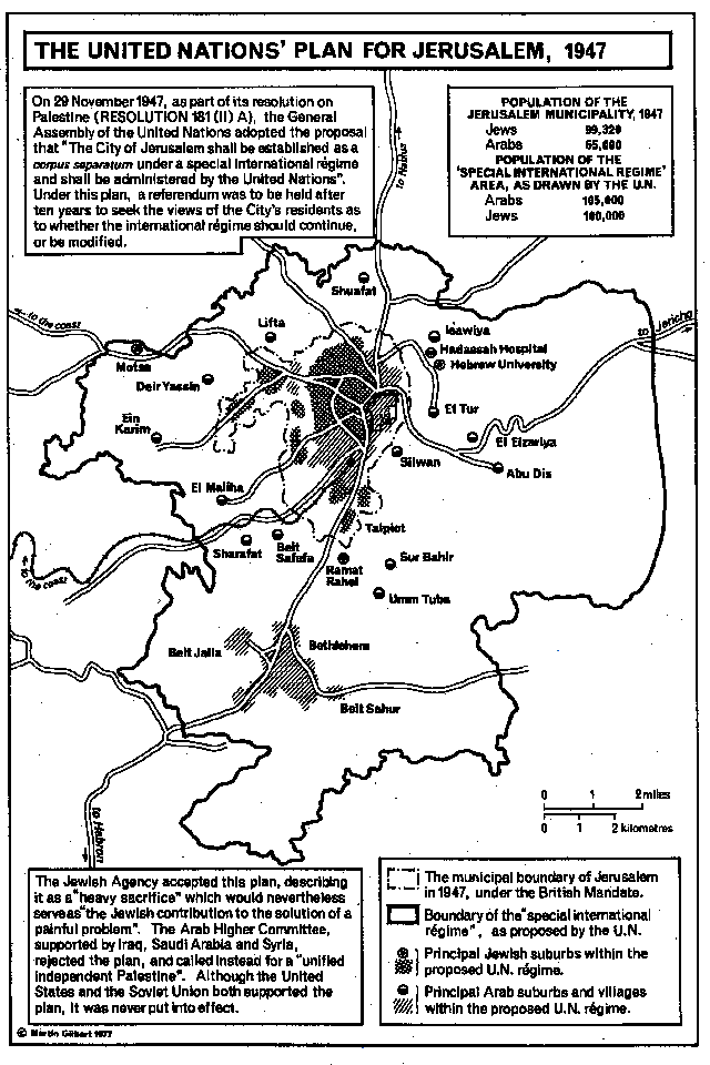 Het gebied van Jeruzalem werd zo groot genomen, dat de Arabieren de bevolkingsmeerderheid hadden. Het omvatte ook Bethlehem met omgeving. Desondanks wezen zij het af. |