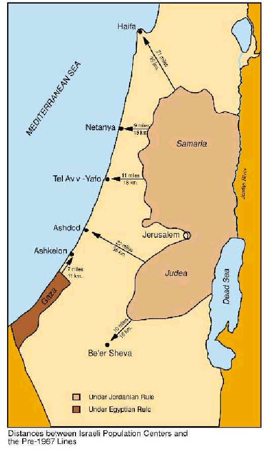 Op deze kaart is ook duidelijk de militaire kwetsbaarheid van Israël te zien. Het Jordaanse leger stond op 18 km van de zee bij Tel Aviv, het dichtst bevolkte gedeelte van Israël. |