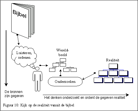 Met u zullen alle geslachten op de aarde gezegend worden. Deze beloften vormen het kader waarbinnen Israël leefde, en nog steeds leeft. Om dat spreken heen en vanuit dat spreken is die natie opgebouwd. De basis voor de hele sociale en maatschappelijke structuur was in principe in die inzettingen gegeven. Denk bv. aan de wetten voor de vreemdelingen, de wetten ter voorkoming van armoede, zoals het sabbatsjaar en het jubeljaar. Maar ook de morele, de zedelijke structuur, de wetten voor huwelijk en samenleving. En de religieuze structuur. De hele tempeldienst verwees naar de menselijke zonden en tekorten en hoe God daarover verzoening deed, zodat de communicatie met Hem op gang zou blijven, en zijn zegen hen zou kunnen bereiken. Het in gehoorzaamheid uitbouwen en onderhouden van die inzettingen zou van Israël een volk maken dat de wereld ten voorbeeld zou zijn in alle aspecten. Mozes spreekt daarover uitgebreid in zijn grote rede, gehouden aan de grenzen van het land dat zij in bezit zouden gaan nemen. Wij vinden die rede in het boek Deuteronomium. Hij zegt daar o.a.: “De HEER zal u altijd de eerste plaats laten bekleden en nooit de laatste. U zult iedereen voorbijstreven en nooit achteropraken, als u de geboden van de HEER, uw God, gehoorzaamt en ze strikt naleeft” (Deuteronomium 28:13). Maar, zoals we al eerder zagen, zo is het helaas niet gebeurd. Israëls geschiedenis is een geschiedenis van afval en terugkeer, telkens weer. Mozes had dat indertijd wel scherp gezien. Maar toch zijn er perioden geweest, wanneer het volk en zijn leiders begonnen Gods inzettingen weer te onderhouden en Hem alleen te dienen, dat er iets en soms veel van de beloften van God zijn gerealiseerd. En we denken dan aan de eerste generatie na Jozua, de tijd van David en Salomo, de oplevingen onder Hizkia en Josia. Omdat God gesproken had, behoefde het volk Israël niet te gaan zoeken naar de bronnen van zijn kennen, die waren gegeven. Ook was het niet nodig om te gaan zoeken naar de wetten voor een rechtvaardige samenleving. Ook die waren in principe gegeven. Nog minder moest het zich bezig houden met epistemologische vraagstukken, want in de Bijbel hadden zij het antwoord reeds: Gods plan voor mens en kosmos wordt, mede door dit volk, op deze aarde in de mensengeschiedenis gerealiseerd. Alle elementen zijn daar, en met elkaar in evenwicht (zie de figuur op deze pagina). Om die reden heeft dit volk zijn energie kunnen wijden aan het toepassen en het uitwerken van wat reeds voorgegeven was. En daarin zijn zij ware meesters gebleken. En deze denkwijze, deze levenswijze, deze wereldbeschouwing zo men wil, kwam met de verkondiging van het evangelie van Jezus’ opstanding de Europese wereld binnen. En stuitte daar op een geheel andere denk- en leefwijze: de Griekse, die door de Romeinse wereld was geabsorbeerd en aangepast. Overigens was dit niet de eerste confrontatie met de Griekse denkwereld. In de laatste eeuwen voor onze jaartelling was er de confrontatie met het toenmalige hellenisme, geconcentreerd in de Egyptische stad Alexandrië. En het grote monument van deze ontmoeting hebben wij nog steeds: de Griekse vertaling van het oude testament, de zgn. “Septuagint” (vertaling van de zeventig). Hieronder een overzicht hoe de (ontdekking van de) realiteit er vanuit de Bijbel uit ziet.
