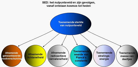 Wat de wetenschap vooruit brengt [1] Op het gebied van de kosmologie zijn de laatste decennia verschillende tot nu onbekende zaken ontdekt, maar ook zijn al wel bekende dingen veel beter begrepen. Er is momenteel veel discussie – die hoofdzakelijk op het Internet wordt gevoerd – over de betekenis van deze ontdekkingen en hun samenhang. Velen vermoeden dat een kosmologische revolutie voor de deur staat. De SRI fysicus Lambert T. Dolphin zei het als volgt: “Iedereen vergeet gemakkelijk dat veel van de hedendaagse wetenschappelijke ‘orthodoxie’ voortkwam uit de impopulaire ketterijen van gisteren. Een van de kenmerken van een goede wetenschapper is, om niet bang te zijn om datgene ter discussie te stellen wat door anderen voor waar werd aangenomen (misschien al decennia lang of langer)" [2]. Een ander citaat: “Het is geen goede wetenschap om onverwachte gegevens te veronachtzamen of om een conclusie te negeren vanwege bepaalde vooronderstellingen. Sir Henry Dale, indertijd president van de Londense Royal Society, haalde het volgende aan in zijn afscheidsrede: “De wetenschap moet niet toestaan dat er wordt ingeleverd op nauwgezetheid, of dat onregelmatigheden en uitzonderingen worden genegeerd, maar moet altijd bescheiden maar moedig het antwoord geven dat de Natuur haar oplevert”. Als je dit doet, kan het zijn dat je niet in de hoofdstroom van de moderne wetenschap staat, maar tenminste zoeken we dan naar de waarheid en boeken voortgang, inplaats van de wetenschappelijke status quo te handhaven” [3]. In dit artikel proberen we de onderwerpen die in vorige artikelen aan de orde zijn geweest, te combineren, en zullen aantonen dat deze mogelijkerwijs aanleiding geven tot een nieuw kosmologisch model. Zero Point Energie (ZPE) en andere kosmologische grootheden Wat betekenen nu al deze nieuwe gegevens voor ons verstaan van het universum? Wanneer we de resultaten van al deze nieuwe onderzoeken combineren, dan lijkt één conclusie voor de hand te liggen, nl. dat allerlei grootheden in de kosmos direct afhankelijk zijn van één entiteit, nl. de sterkte van het Zero Point Field (ZPF; zie de figuur hieronder):