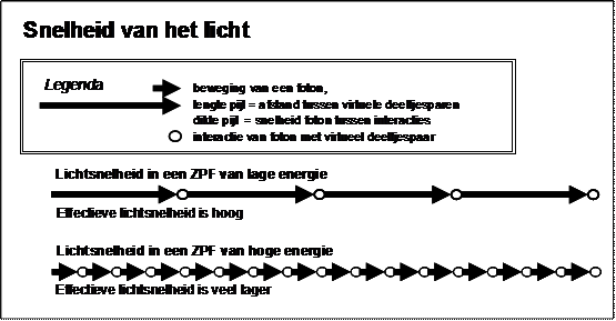 2. Het ZPF is echter ook drager van de elektromagnetische straling, waaronder ook het licht valt. Als dat ZPF minder energie bezit, d.w.z. als er minder deeltjes per cm3 zijn, en als consequentie minder virtuele deeltjesparen die per cm3 in en uit bestaan flitsen, dan moet elektromagnetische straling minder interacties ondergaan met deze virtuele deeltjesparen uit het ZPF, en gaat dus sneller. Ongeveer zoals een hordenloper sneller vooruitkomt als er minder horden zijn of, om een moderner beeld te gebruiken: hoe meer drempels in een straat, des te meer wordt het verkeer afgeremd, ook als tussen de drempels in snel wordt gereden (zie voor verduidelijking de figuur hieronder). In een eerder artikel over de lichtsnelheid is al aangegeven, dat Barry Setterfield de eerste was die een serieus en consequent onderzoek naar het verloop van de lichtsnelheid heeft gedaan, onder gebruikmaking van alle gegevens die daarover in de loop der tijd