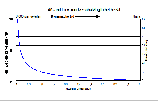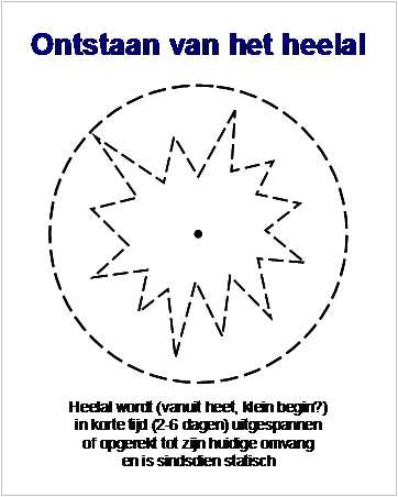 Op de x-as (onderste) zien we de afstand afgezet, waarbij de waarde 0 (nul) is onze omgeving, de waarde 1 de grens van het thans waarneembare heelal. Op de rechter y-as is de roodverschuiving aangegeven, die in de grafiek maximaal 1,4 is, maar in werkelijkheid groter kan zijn. Om praktische redenen (de curve gaat een heel eind steil omhoog, nadert de y-as en voegt weinig informatie toe) stoppen we bij 1,4. Er is te zien, dat op grotere afstanden de curve steiler gaat lopen. Dit is een algemeen bekend en geaccepteerd verschijnsel. De oorspronkelijke, lineaire wet van Hubble bleek rond 1960 niet meer te handhaven en is vervangen door een wat ingewikkelder vergelijking (z = {[1+(v/c)] / √[1-(v2/c2)} - 1). Hierboven zagen we dat de (gekwantiseerde) roodverschuiving wordt veroorzaakt doordat licht van zeer veraf staande stelsels, dat ons nu bereikt, is uitgezonden op een tijdstip in het verleden toen het ZPF een veel lager energieniveau had. De consequentie is, dat toen ook de lichtsnelheid evenredig hoger was. Dezelfde curve kan dus nu dienen om het verband aan te geven tussen de dynamische tijd (dat is de ‘gewone’ tijd die wij dagelijks gebruiken en waarmee we historische gebeurtenissen dateren), die aangegeven wordt op de bovenste x-as, en de lichtsnelheid, die langs de linkse y-as is afgezet. Het is opmerkelijk dat deze curve, die ontstaan is uit onderzoekingen naar de roodverschuiving, verrassend goed past op de curve voor de afnemende lichtsnelheid, die Setterfield in zijn publicatie van 1987 had gevonden. Hier komen dus twee totaal onafhankelijke onderzoeken samen in hun resultaten! Maar omdat de snelheid van nucleaire vervalprocessen evenredig is met de lichtsnelheid, geeft deze curve ook de verhouding weer tussen dynamische tijd en atoomtijd (dat is de tijd die we meten als we uitgaan van de nucleaire vervalprocessen). Consequentie: In atoomtijd is het heelal rond 15 miljard jaar oud, in dynamische tijd rond 8.000 jaar. Het zal misschien wat moeite kosten om deze grafiek met al zijn consequenties te verwerken, het is allemaal nogal compact. Het is opvallend, hoe al deze dingen in elkaar grijpen. Deze combinatie van elkaar versterkende en ondersteunende gegevens maken het model zeer robuust. Je zou kunnen zeggen dat Setterfields onderzoek naar de lichtsnelheid hierdoor overbodig is geworden. Vanuit de kennis en het inzicht dat we nu hebben, is dat ook wel zo, maar het is de vraag of we zonder dat onderzoek op dit punt zouden zijn aangeland. Het is meer dan opvallend, dat zijn resultaten zo treffend overeenkomen met wat gebleken is uit de onderzoeken naar het Zero Point Field en de roodverschuiving. Een verbluffende coïncidentie? Een nieuw kosmologisch model Hier volg ik Setterfield, omdat hij bij mijn weten de enige is, die de volle consequenties van dit alles heeft getrokken en gepubliceerd. Hoe stelt hij zich nu het ontstaan van het heelal voor, gegeven al deze, door iedere wetenschapper te verifiëren gegevens?