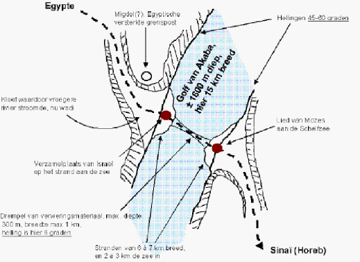Waar is de Schelfzee? Opm.: In de NBG-vertaling 1951 wordt “Schelfzee” gebruikt als naam voor de zee van de doortocht, in de meeste andere vertalingen wordt de naam “Rode Zee” gebruikt. De NBV-vertaling heeft in een aantal gevallen ook de - overigens foute - vertaling "Rietzee". Dus: overal waar in de Bijbel-aanhalingen “Rode Zee” of "Rietzee" staat, is dat synoniem met het hier gebruikte “Schelfzee” De gebruikelijke opvatting is dat de Israëlieten door een soort moeras trokken aan het noordelijke uiteinde van de Golf van Suez. De sterke oostenwind blies het ondiepe water weg en het volk trok over de moerassige grond naar de overkant. De Egyptische cavalerie volgde hen en moet meer zijn versmoord dan verdronken. Ik heb me altijd afgevraagd waarom de Egyptenaren niet een paar kilometer omreden en de Israëlieten aan de andere kant opwachtten. Met zo'n cavalerie van strijdwagens is dat in een uurtje gebeurd. Niets is toch eenvoudiger? En de farao's waren grote strategen, niet zulke simpele zielen op militair gebied. Hoe zit dat? Wat zegt de Bijbel over de locatie van de Schelfzee? Hierna volgt een gedetailleerd overzicht over wat de Bijbel zegt over de plek waar de Israëlieten de Schelfzee kruisten. Tot mijn grote verrassing blijkt dat de Golf van Akaba te zijn. Omdat dat zo zonneklaar is, begrijp ik niet dat de gebruikelijke opvatting zo hardnekkig stand heeft kunnen houden door de eeuwen heen. Wie kan dat voor mij verklaren? Een goed gedocumenteerde e-mail (voor e-mail adres zie Home page) stel ik zeer op prijs. Zie de kaart van de woestijn en de detailkaart op deze pagina. Ik heb alleen die zes Bijbelgedeelten uit de NBG 1951-vertaling genomen die de Schelfzee verbinden met enig ander geografisch element. De resterende 18 passages die de Schelfzee noemen geven geen houvast voor wat betreft de geografische plaats. (De citaten zijn uit de NBV, die vaak Rode Zee geeft i.p.v. Schelfzee.) Exodus 23:31 Ik zal jullie een gebied geven dat zich uitstrekt van de Rode Zee tot aan de zee waaraan de Filistijnen wonen, en van de woestijn tot aan de Eufraat. De bewoners van dat hele gebied geef ik in jullie macht, en jullie zullen hen verdrijven.. Opm.: Wil deze passage enige zin hebben, dan is de Schelfzee (Rode Zee) de Golf van Akaba. Van woestijn tot de Eufraat, dat is de noord-zuid richting (preciezer noordoost-zuidwest), en Schelfzee tot Zee bij de Filistijnen, moet dan zuidoost-noordwest zijn. Gezien de Zee waaraan de Filistijnen wonen de Middellandse Zee is, en dan speciaal bij het zuidelijk deel van de Palestijnse kust (Gaza-strook), kan het niet anders of de Schelfzee moet de Golf van Akaba zijn. Numeri 14:25 Nu wonen daar de Amalekieten en Kanaänieten nog in de valleien. Keer morgen om en trek de woestijn weer in, in de richting van de Rode Zee.’ Opm.: Alhoewel de geografische plaats van de Schelfzee (Rode Zee) niet direct in het oog springt, is het toch wel logisch om aan te nemen dat de route vanuit de woestijn Zin (noordelijke Negev) naar een "zee", niet anders dan naar de Golf van Akaba kan gaan. Zeker wanneer daarbij wordt gezegd, dat de blikrichting eerst het land Kanaän was, en dan het bevel volgt: wendt u om. Numeri 21:4 Van de Hor trokken ze verder in de richting van de Rode Zee; ze moesten immers om Edom heen trekken. Maar onderweg werd het volk ongeduldig. Opm.: De berg Hor ligt ergens in de Negev of in de Araba, de plaats is onduidelijk. Het land Edom ligt ten oosten van de Araba. Als je vanuit de Negev/Araba naar een zee moet om rond Edom te trekken, dan is er weinig keus. De Golf van Akaba dus. Deuteronomium 2:1 Ten slotte zijn we omgekeerd en de woestijn weer in getrokken, in de richting van de Rode Zee, zoals de HEER mij had opgedragen. Jarenlang trokken we om het Seïrgebergte heen. Opm.: Van Kades (ergens op de grens van Negev en Sinaï), via een zee, om het gebergte Seïr (woonplaats van Edom) heen, ja dat kan alleen maar de Golf van Akaba zijn. (Opm.: vele andere vertalingen hebben ‘vele dagen’, ‘lange tijd’, i.p.v. ‘jarenlang’) 1 Koningen 9:26 Koning Salomo had ook een vloot laten bouwen, in Esjon-Geber bij Elat, aan de kust van de Rode Zee, in Edom Opm.: Rode Zee (Schelfzee) = Golf van Akaba, want daar liggen Esjon-Geber en (nog steeds) Elot (of Eilat). Jeremia 49:21 De aarde beeft van Edoms val, hun gejammer klinkt tot aan de Rode Zee. Opm.: Het gaat hier over een gericht van de Heer tegen Edom, tegen Teman (een stad in Edom). Als die valt, wordt het gejammer aan de Schelfzee (Rode Zee) gehoord. De Schelfzee is al meer genoemd in verband met Edom. Bovendien is het onwaarschijnlijk, dat het geluid van hun val niet de Golf van Akaba zou bereiken, maar wel bijv. de Golf van Suez (de meest gebruikelijke locatie voor ”Schelfzee”). Conclusie: Overal waar de naam “Schelfzee” (Rode Zee) wordt genoemd in verband met enige andere, geografische locatie, is altijd maar één uitleg acceptabel, nl.: Schelfzee = Golf van Akaba. Op Internet is een goed gedocumenteerd artikel hierover te vinden op deze webpagina. Waarom is de Golf van Akaba zo lang buiten beeld gebleven? De reden is waarschijnlijk dat niemand meer wist dat die Golf van Akaba bestond en waar die dan was. Op veel oude kaarten staat de brede Rode Zee alleen in noord-westelijke richting verlengd naar Suez en is er geen, ofwel een kleine uitstulping naar Akaba. Dus dat water was onbekend!! Hoe kon Israël een zo diep water als de Golf van Akaba kruisen? Een vraag die direct opkomt is: hoe konden de Israëlieten een diepe zee als de Golf van Akaba kruisen? Enkele opmerkingen daarover: 1 De Golf is rond 1600 meter diep, en op de waarschijnlijke plaats van de doortocht ongeveer 800 meter, met hellingen van maximaal 8%, steil, maar zonder grote inspanning te doen. Deze betrekkelijke ondiepte is veroorzaakt door sediment dat van weerskanten, juist tegenover elkaar in de Golf is aangevoerd door rivieren die vanuit de beide woestijnen naar die plaats gevloeid zijn. Aan beide zijden zijn z
