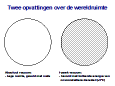 (Wetenschappelijke onderwerpen / Een nieuw kosmologisch model) Het vacuum en de nulpuntsenergie (ZPE) Nieuw 14/09/2004, volledig omgewerkt 01/01/2017 Samenvatting: Is de wereldruimte een grote leegte, afgezien van sterren, planeten, stofwolken en sterrenstelsels, of ziet dat er toch wat minder simpel uit? Hoe plant licht zich voort, hoe zwaartekracht? Vragen! Maar toch ook wat antwoorden. Wat is het vacuüm? In de loop der tijden zijn er verschillende opvattingen geweest over de wereldruimte, waarbinnen zich de astronomische objecten (sterren sterrenstelsels, quasars, etc.) bevinden. Vroeger dacht men zich deze ruimte als een totale leegte, maar bepaalde Griekse denkers zagen deze ruimte gevuld met kleine deeltjes ‘atomen’ genoemd, die daar rondzwierven en bij botsing zich verenigden tot allerlei objecten. In de kosmologie van Aristoteles/ Ptolemaeus was de wereldruimte gevuld met een stof die men ether noemde. Maar in de Newtonse kosmologie was de wereldruimte leeg, een volstrekt vacuüm (zie afbeelding hieronder). Toen in de 19e eeuw de kennis van elektromagnetische straling zich uitbreidde, was er ook weer behoefte aan een medium waarin die straling zich zou moeten voortplanten. De oude term ‘ether’ werd hiervoor weer van stal gehaald. Men had bepaalde opvattingen over de eigenschappen van die ether. De experimenten van Michelson en Morley in 1887 poogden het bestaan van die ether vast te stellen en ook of het de beoogde eigenschappen had. De uitkomsten waren teleurstellend, en men besloot dat de ether vergeten moest worden. Toch heeft Einstein nog tot in 1929 geloofd aan het bestaan van dat medium voor de elektromagnetische straling, want hij noemde het nog in een toespraak in dat jaar. De verdere ontwikkeling, gestuurd door relativiteit en kwantummechanica, kon kennelijk ook zonder de aanname van dit medium voor de elektromagnetische straling. Toch bleven er vragen. Zie bijv. de discussie over het horizonprobleem en de stabiliteit van het heelal. [1] En langs een heel andere weg dook het probleem van de aard van het vacuüm weer op. Zero Point Energy (ZPE) en het vacuüm [1]