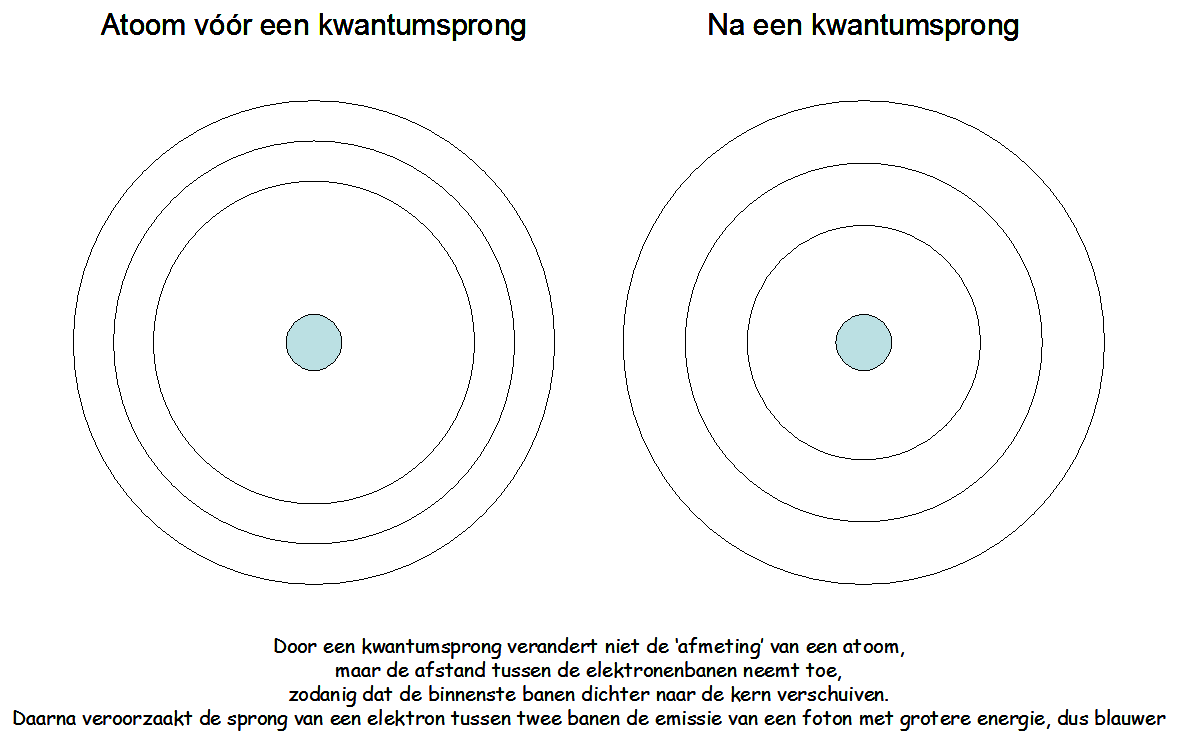 We zagen al dat het nulpuntsveld (ZPF) verantwoordelijk is voor de energie van de atomen. Bij een lagere energie in het nulpuntsveld hebben ook de atomen een lagere energie, de verschillende elektronenbanen liggen dichter bij elkaar, en een elektron dat van baan wisselt levert dan ook fotonen met een lagere energie op, dat wil zeggen dat het uitgestraalde licht dan roder is. De toename van de energie in het nulpuntsveld gaat geleidelijk. Maar atomen kunnen hun energie niet geleidelijk aanpassen. Zij moeten wachten tot er een ‘kwantum’ van energie is opgebouwd. Zodra dat het geval is, passen alle atomen in het heelal hun energieniveau in één sprong aan. Vanaf dat moment zijn de elektronenbanen verder van elkaar verwijderd, wat inhoudt dat de elektronenbanen dichter naar de kern opschuiven. Aan de 'afmeting' van het atoom verandert niets. Als er nu een elektron uit een hogere, energieke baan naar een lagere, minder energieke baan springt, wordt er door het verschil in energie een foton van hogere energie uitgezonden (zie de figuur). Het licht wordt dus blauwer. Wat zien wij dus als we verder het heelal in kijken, dus naar een verder verleden? Licht dat steeds roder wordt, en wel in sprongetjes, ‘kwanta’. Zie verder het artikel Roodverschuiving. Waar komt nu dat ZPF vandaan? We zagen al in het vorige hoofdstuk, dat de SED-benadering het antwoord geeft, dat de ZPE een kosmologische oorsprong heeft en te maken heeft met ontstaan van het heelal. We hebben met deze gegevens omtrent het Zero Point Field een belangrijke bouwsteen in handen van de nieuwe kosmologie, die zich voor onze ogen schijnt te ontvouwen. Nog over deeltjes In de Big Bang wordt aangegeven dat er ongeveer evenveel deeltjes als antideeltjes moeten zijn. Maar in de kwantumtheorie QED zijn die nergens te vinden. In de theorie van het ZPF, SED, zijn ze er wel. Ze maken het Zero Point Field uit. Blijkbaar zijn er een fractie meer deeltjes dan antideeltjes ontstaan (geschapen). Deze fractie maakt de hele materie van het heelal uit. Dus een materialist heeft echt maar heel weinig in handen. De overweldigende meerderheid van de deeltjes zit als deeltjesparen in het ZPF. Laten we nu gaan kijken naar andere bouwsteen: nieuwe ontdekkingen betreffende de roodverschuiving.