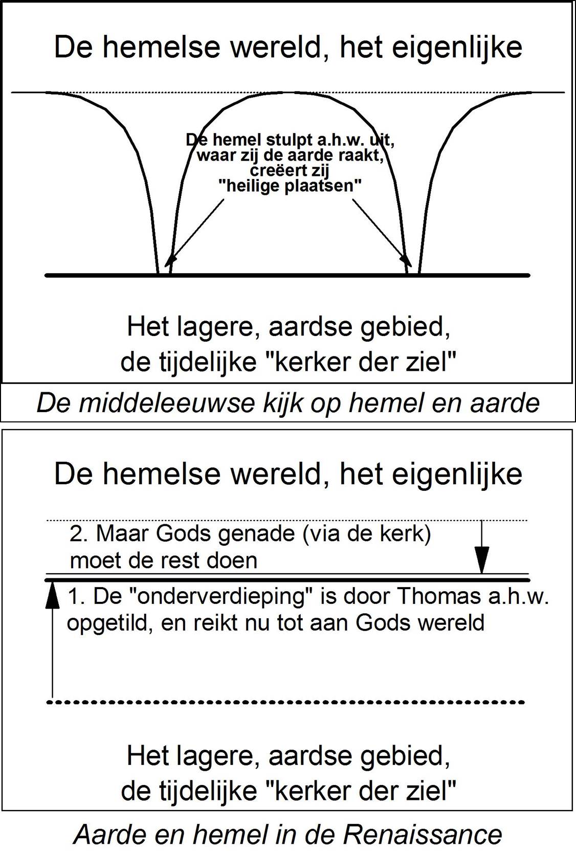 Uit het schema is al te zien, hoezeer de kerk het platonische beeld heeft overgenomen. Dat ligt ook wel voor de hand, omdat Plato een overheersende rol speelde in de opleiding van de kerkleiders. Op deze manier werd het gewone leven eigenlijk iets dat van geen of minder belang werd, wat bijv. uitkwam in de instelling van het celibaat voor priesters, en het beperken van seksuele omgang tot de uitdrukkelijke bedoeling om kinderen te verwekken. Iedere hint of verwijzing naar lust als belangrijk en door God zo gewild (zie het Hooglied bijv.) werd met afgrijzen van de hand gewezen. Eén van de ‘kerkvaders’, Origenes, heeft zich zelfs laten castreren, maar had daar later weer spijt van. Daartegen moest wel een tegenbeweging opkomen. En die komt ook, na de kruistochten, als mensen kennis hebben kunnen nemen van de enorme culturele schatten van de Arabische wereld, en de kennis van de Griekse denkers in die cultuur. En tegenover de voor de ‘benedenverdieping’ steriele Plato werd nu de filosoof van die ‘benedenverdieping’, de heiden Aristoteles, omarmd. Vooral de intellectuelen in diverse – in die tijd gestichte – universiteiten gingen met Aristoteles aan de haal en daagden de theologen uit, die in meerderheid platonisch dachten. Die ’benedenverdieping’ werd door hen beschouwd als autonoom. Dat veroorzaakte een groeiende tegenstelling in de kerk. Ook in kloosters werd Aristoteles bestudeerd. In het diepste geheim, dat wel. Want als er tegen zo’n klooster een verdenking rees, werd de Inquisitie er op af gestuurd. In het boek De Naam van de Roos van Umberto Eco wordt o.a. zo’n situatie beschreven. 7. Aristoteles, Thomas van Aquino, dilemma natuur en genade