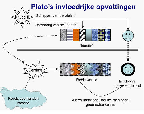 In deze presentatie wordt gebruik gemaakt van het schema van de ‘twee verdiepingen’, een model dat bij mijn weten voor het eerst is gebruikt door dr. Francis A. Schaeffer in zijn boek ‘The God who is there’. Het geeft aan dat er twee werelden zijn, die hoewel onderscheiden, niet geheel gescheiden zijn. In de verschillende fasen van de ontwikkeling van het Europese denken, hebben die verdiepingen een veranderende inhoud, zoals zal blijken. De ‘benedenverdieping’ is dan de wereld die we met onze zintuigen kunnen waarnemen. Het is ook de wereld waarover de wetenschap informatie verzamelt, die gebruikt wordt om kennismodellen te bevolken. De ‘bovenverdieping’ is de wereld, die we niet direct kunnen waarnemen maar waarvan alle volken en mensen over de hele wereld en door de hele geschiedenis het bestaan minstens hebben vermoed. Een uitzondering is onze (post)moderne wereld, waarin zelfs het noemen van iets dat niet volledig binnen de ‘benedenverdieping’ kan worden verklaard, grote emoties oproept binnen de wetenschappelijke wereld, en niet alleen daar. De ‘bovenverdieping’ is dan bij zulke mensen non-existent, of beter: eventueel beneden geseculariseerd geïntegreerd. Dit is dus de algemene vorm. Omdat in het besef van vele volken die ‘bovenverdieping’ van belang is voor het leven hier beneden, worden er methoden ontwikkeld om contact met die bovenverdieping te maken, c.q. te herstellen. Dat gebeurt soms door medicijnmannen, sjamanen, zieners, maar in Israël ging het juist andersom, daar was het God die de profeten rechtstreeks aansprak. Algemeen was de notie, dat (een) God, vaak één die boven de wereld van goden en demonen uitstak en daarover heerschappij had, de hele werkelijkheid van de ‘onderverdieping’ had geschapen. In de Bijbel is de ‘bovenverdieping’ niet onkenbaar, omdat God gesproken heeft. Zijn spreken is opgetekend in de Bijbel. Ook bij Israël is het initiatief voor het contact tussen ‘boven’ en ‘beneden’ bij God. Deze kennis ontstaat doordat God zich openbaart. Je ziet dan ook dat in de Bijbel de ‘bovenverdieping’ en de ‘benedenverdieping’ innig verweven zijn. God spreekt tot mensen (profeten), treedt handelend op in de geschiedenis, voorzegt toekomstige gebeurtenissen, die zich inderdaad ook zo afwikkelen als voorzegd is. De Bijbel is hierin binnen alle zgn. ’wereldgodsdiensten’ volstrekt uniek. In de presentatie wordt het model met de rechthoeken consequent vervolgd. Maar hier stellen we Plato’s denkwereld nog iets anders en wat meer gedetailleerd voor. Plato was een leerling van Socrates en erg onder de indruk gekomen van het grote probleem, hoe er echte kennis over de dingen te verkrijgen is. En niet alleen over de dingen, ook over zulke abstracties als Rechtvaardigheid, Eerlijkheid, Deugd, Waarheid, Goedheid, Schoonheid. Zijn leermeester had door steeds maar te blijven doorvragen, het vertrouwen van de Atheners in hun juiste opvattingen en goede instellingen behoorlijk aan het wankelen gebracht. Vanwege zijn optreden als onruststoker, werd hij tot de gifbeker veroordeeld. Plato dacht dus na over deze dingen, vond dat je niet kon stoppen bij indringende vragen, maar ook antwoorden moest bieden, en hij ontwikkelde dus een eigen filosofisch stelsel. Hij geloofde dat er achter de ‘goden’ een godheid moest zijn, waarin de laatste en hoogste waarden van schoonheid en goedheid, de normen van kennen en handelen, waren verankerd. Die godheid was de schepper en bron van de hemelse Ideeën, terwijl de zichtbare realiteit was gemaakt door een enigszins gehandicapte schepper van de tweede rang, de demiurg, die de materie al ter beschikking had. Daarop kon hij geen invloed uitoefenen. Dat er daarom dan ook zo’n beroerde wereld uit voortkwam, ligt voor de hand. Die zichtbare wereld en de zintuiglijke waarneming stonden niet hoog aangeschreven. Plato stond in discussie met verschillende van zijn voorgangers, juist in verband met dat scheppen. Er waren er die hadden beweerd, dat alles was ontstaan uit toeval, door evolutie. Daar tegenover hield Plato met kracht van argumenten staande, dat al het bestaande alleen verklaard kan worden, als men aanneemt dat het door een godheid tot stand is gebracht. Zo krachtig en moeilijk weerlegbaar was Plato’s verdediging van zijn ‘creationisme’, dat zijn tegenstanders zich een tijd lang stil hielden. Hieronder een beeld van Plato’s opvattingen: