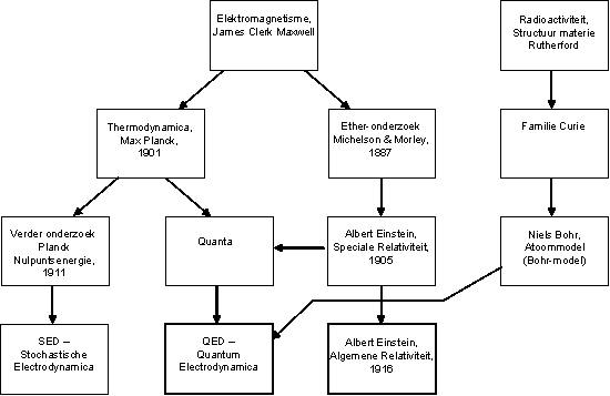 Het klassieke model van het heelal Het klassieke model van de wereld was dat van Aristoteles/Ptolemaeus. Zie pagina over Aristoteles' model.. Het licht had in dit model een oneindige snelheid, voor zover men zich daar een denkbeeld van had gevormd. Een nieuw model In de 16e eeuw stelde Copernicus (Niklaus Koppernigk 1473-1543) een model van het zonnestelsel voor, waarin de zon in het middelpunt stond en de aarde met alle planeten eromheen draaiden. De aarde draaide in 24 uur om zijn as en in 1 jaar om de zon. De planetenbanen waren bij Copernicus nog cirkelvormig, en dus moest hij allerlei hulpbanen bedenken om het een beetje te laten kloppen. De Deen Tycho Brahe (1546-1601) heeft enorm veel metingen gedaan. Zijn leerling Johannes Kepler (1571-1630) zette zijn werk voort, en ontdekte dat de planetenbanen ellipsen zijn. Dat was pas echt een revolutie! Ellipsen!!! In één klap verdwenen alle hulpbanen en epicykels van het toneel. Lang is daarover nog getwist en gediscussieerd, want Aristoteles lag nu in de kosmologie echt op zijn achterste. Galileï (1564-1642) was de eerste die empirisch bewijs vond voor Copernicus’ model. De verdere ontwikkeling loopt dan via Isaac Newton (1642-1727) die de wetten van de zwaartekracht definieerde. In grote lijnen is nu het nieuwe astronomische beeld van de wereld gereed. De sterren staan nog steeds ver weg, al krijgen ze wel steeds meer aandacht. Tycho Brahe bijv. had grote aandacht voor nova’s en supernova’s. De wereldruimte (het vacuüm) dacht men zich nog als een absolute leegte, en de lichtsnelheid aanvankelijk nog als oneindig groot. Toen de Deen Ole Christensen Rømer (zie voor dat laatste de paragraaf over lichtsnelheid) vaststelde dat het licht een eindige snelheid had, begon men na te denken wat licht dan wel was en ook over het medium waarin dat licht zich dan wel moest voortbewegen. Men noemde dat medium ‘ether’. Het was onzichtbaar, onmerkbaar, het hele heelal en alles daarin was ermee gevuld, en het geleidde dus kennelijk licht. Verdere ontdekkingen Had Newton zich nauwelijks uitgelaten over de aard van de krachten, die zijn universum bijeenhielden en die de door hem geformuleerde bewegingen veroorzaakten en in stand hielden, het was niet te verwachten dat de wetenschap zich daarmee tevreden zou stellen. Vanaf de tweede helft van de achttiende eeuw tot in onze tijd toe wordt steeds meer duidelijk dat de macrokosmos (het heelal) en de microkosmos (de wereld van het hele kleine) in zeer nauw verband met elkaar staan. Opeenvolgende ontdekkingen deden het inzicht in de krachten die beide bestuurden, sterk toenemen. Maar daarmee doken ook fundamentele problemen op. Laten we eens zien wat er globaal gebeurde. Elektriciteit en magnetisme Magnetisme was al lang bekend, de Chinezen schijnen het als