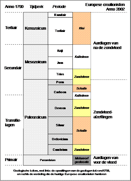 altaar dat hij bouwde, en soms ook een bericht over de regenboog. De meeste volksverhalen hebben vaak niet meer dan fragmenten uit de geschiedenis van de vloed, maar het Miautso-volk dat in China woont, heeft een mondelinge overlevering door de eeuwen heen bewaard, die verrassend veel van het bijbelse bericht bevat. Ook is bij hen een stamboom overgeleverd, die – weliswaar verminkt – tot Adam teruggaat. Noach heet daar Nuah, zelfs zijn vrouw wordt genoemd: Gaw Bo-lu-en. Zijn zonen 1. Lo-Han (Cham) met zijn zonen Cusah (Kus) en Mesay (Misraim), 2. Lo-Shem (Sem) met zijn zonen Elan (Elam) en Nga-shur (Assur), 3. Jah-phu of Lo Jah-phu (Jafet) met zijn zoon Go-men (Gomer), die ook de stamvader van de Miautso is2). Het zondvloedverhaal in het Gilgamesh epos geeft ons onmogelijke verhoudingen voor de ark, nl. lengte = breedte = hoogte, een kubus dus. Je moet geen scheepsbouwspecialist zijn om in te zien dat zo’n kubus de meest onstabiele vorm is die je bedenken kunt, en volstrekt ongeschikt voor het doel waarvoor hij diende, nl. om in de woeste zondvloedwateren veilig te kunnen overleven. Alleen het bijbelse bericht geeft ons een volkomen geloofwaardige beschrijving van deze voor menselijke begrippen onvoorstelbare gebeurtenis. Het is nl. ingebed in een serie opeenvolgende familiegeschiedenissen, die een groot deel van het boek Genesis uitmaken. Zie het werk van P.J. Wiseman. Wanneer ik zeg: geloofwaardig, dan geldt dat uiteraard voor diegenen die zich (hebben) kunnen losweken van het heersende wetenschappelijke paradigma van de miljarden jaren en de biologische evolutie, geleerd hebben te lezen wat er staat, en durven vertrouwen op eigen oordeel. De zondvloed in de geologie Als we aannemen dat de zondvloed een reële gebeurtenis is geweest, die zich heeft afgespeeld binnen het raam van de menselijke geschiedenis, heeft die ramp dan ook gevolgen gehad, die we heden nog kunnen waarnemen? Tot in de 18e eeuw is deze vraag met een volmondig ‘ja’ beantwoord geweest. Van de sedimentgesteenten die men overal aantreft, werd op grond van aanwezige stromingspatronen aangenomen dat die in stromend water waren afgezet. Er werden diverse zondvloedmodellen ontworpen, waarbij de oorzaken werden gezocht in krachten van binnenuit (hitte en druk, endogeen) of van buitenaf (exogeen); in dit laatste geval werd dan gedacht aan kosmische inslagen van meteorieten en/of kometen, of het passeren van grote hemellichamen, die de aardkorst deden openbarsten, etcetera. Voortgaand onderzoek leidde tot de overtuiging dat er globaal vier perioden waren in die afzettingen. De onderste – die globaal het Precambrium beslaat – noemde men het Primair. Men nam aan dat die van vóór de zondvloed dateerde. Fossielen kwamen hier niet of nauwelijks in voor. De volgende reeks lagen, van Cambrium tot Carboon, werden Transitie-lagen genoemd; deze waren, zo meende men, door de zondvloed afgezet. Van Perm tot Krijt was de derde groep, die men het Secundair noemde. Daarna een groep niet meer versteende lagen, die het Tertiair werden genoemd (zo heten ze tegenwoordig nog). Men had allerlei argumenten ontwikkeld, gebaseerd op nauwkeurige waarnemingen, die aangaven dat alleen de middelste (Transitie-)lagen door de zondvloed waren afgezet. Ten gevolge van het veranderend filosofisch klimaat en de invloed van mensen als Charles Lyell, begon men dit werk te kleineren, en kwam het huidige paradigma op, dat de korte bijbelse chronologie verving door steeds uitdijende tijdsspannes, totdat die momenteel 13,7 miljard jaar voor het heelal, en 4,6 miljard jaar voor de aarde tellen. Binnen dit paradigma was geen plaats meer voor de zondvloed, waarvan het verslag in de Bijbel is bewaard gebleven. Het was immers Lyells adagium ‘to get rid of the Mosaic account’: de bijbelse begingeschiedenis en de wetten van Mozes moesten de laan uit. Het had dus niets te maken met nieuwe gegevens of nieuwe inzichten of zo, integendeel, de feiten uit de realiteit speelden nauwelijks of geen rol in deze nieuwe manier van kijken naar de geschiedenis. Het ging erom om een alternatieve kijk te ontwikkelen, waarbij de invloed van de Bijbel werd uitgeschakeld, daarvoor in de plaats kwamen de actuele, langzame processen die de norm werden voor de verklaring van het verleden. Katastrofes werden uitgezwaaid, alles ging geleidelijk en uiterst kalm. Een tijdlang heeft dit paradigma oppermachtig geheerst, niet alleen in de geologie, maar daar zeker. Totdat er in recente tijden nogal wat gebeurd is, waardoor dit ‘actualistische’ paradigma op losse schroeven is komen te staan, o.a. het ontstaan van het vulkaaneiland Surtsey, de uitbarsting van Mount St.Helens, en het ontdekken van de restanten van reusachtige inslagkraters van wel honderden kilometers doorsnede (o.a. de Chicxulub krater in Yucatan, waarvan men abusievelijk meent dat de gevolgen van deze inslag het uitsterven van de dinosaurussen veroorzaakte). De gebruikelijke opvatting thans is, dat alle lagen katastrofisch zijn ontstaan, maar dat tussen die laagjes lange rustige perioden verliepen waarin hoegenaamd niets gebeurde. De zondvloed opnieuw ten tonele In Amerika verscheen in 1961 het boek van John Whitcomb en Henry Morris3), waarin de hele geologische kolom aan de zondvloed werd toegeschreven. Whitcomb en Morris zijn in de Engelssprekende wereld zo ongeveer gecanoniseerd, hoewel het zonneklaar is, dat de bovenste lagen van de kolom NIET ononderbroken in stromend water afgezet zijn. De Europese creationisten, die niet kritiekloos deze opvatting volgen, zijn van mening, dat alleen de oudste lagen, die van het Paleozoïcum, zondvloedlagen zijn, omdat zij ononderbroken in stromend water zijn afgezet. De stroomrichting is zeer duidelijk waar te nemen, en de directe opvolging blijkt uit het feit, dat er geen bodems, kruipsporen of regendruppels in zijn te vinden of dat enige erosie heeft plaatsgevonden. Bovendien geeft het verloop van de zeespiegel in die periode aan, dat aan het begin de zeespiegel ‘norm