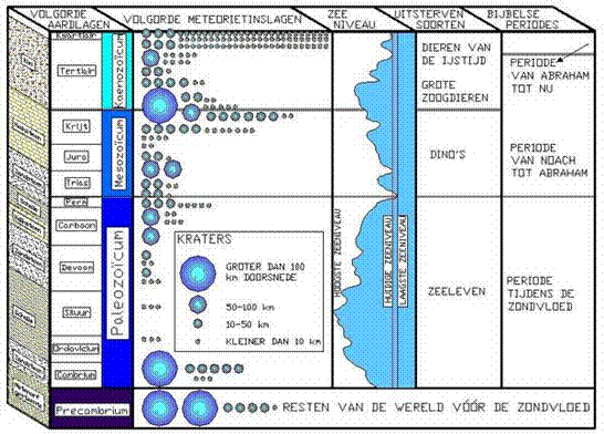 afgrond’ (SV). Wat veroorzaakte de zondvloed? 2. Wetenschappelijke overwegingen Welke situaties, toestanden en/of gebeurtenissen veroorzaakten nu die zondvloed? De 18e eeuwse geologen hadden diverse interne en externe oorzaken genoemd, maar de geringe kennis van de kosmos en het binnenste van de aarde maakten hun modellen hoogst speculatief. Maar in de afgelopen decennia is veel nieuw materiaal beschikbaar gekomen. De hernieuwde belangstelling voor het katastrofale in het ontstaan van de geologische kolom gaf aanleiding tot allerlei ontdekkingen. Zo is thans bekend, dat er op diverse momenten in de geologische tijd kosmische bombardementen op grote schaal hebben plaatsgevonden, waarbij de oudste het hevigst waren en de grootste kraters veroorzaakten, en de jongere van afnemend kaliber waren. Het enorme aantal inslagkraters